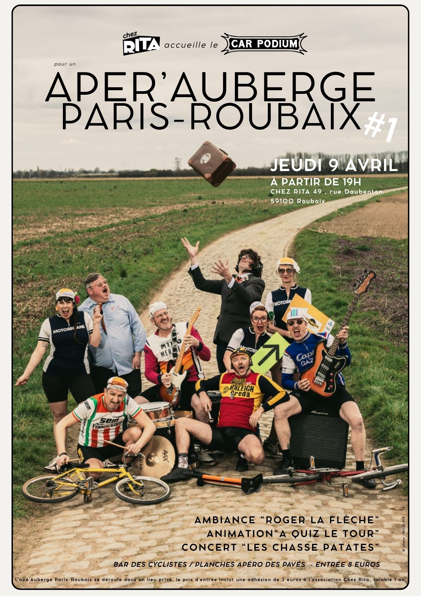L’ APÉR’ AUBERGE PARIS-ROUBAIX #1 mardi 7 avril 2026 , par maxime2 à partir de 19h Ambiance Roger la flèche Animation "À Quiz le tour" Concert "Les chasse patates" Bar des cyclistes / planches apéro des pavés Paf adhérents : 5€ Paf non adhérents : 5€ + Adhésion annuelle 3€ Jeudi 9 avril de 19h00 à 23h00 Chez Rita 49 rue Daubenton à Roubaix